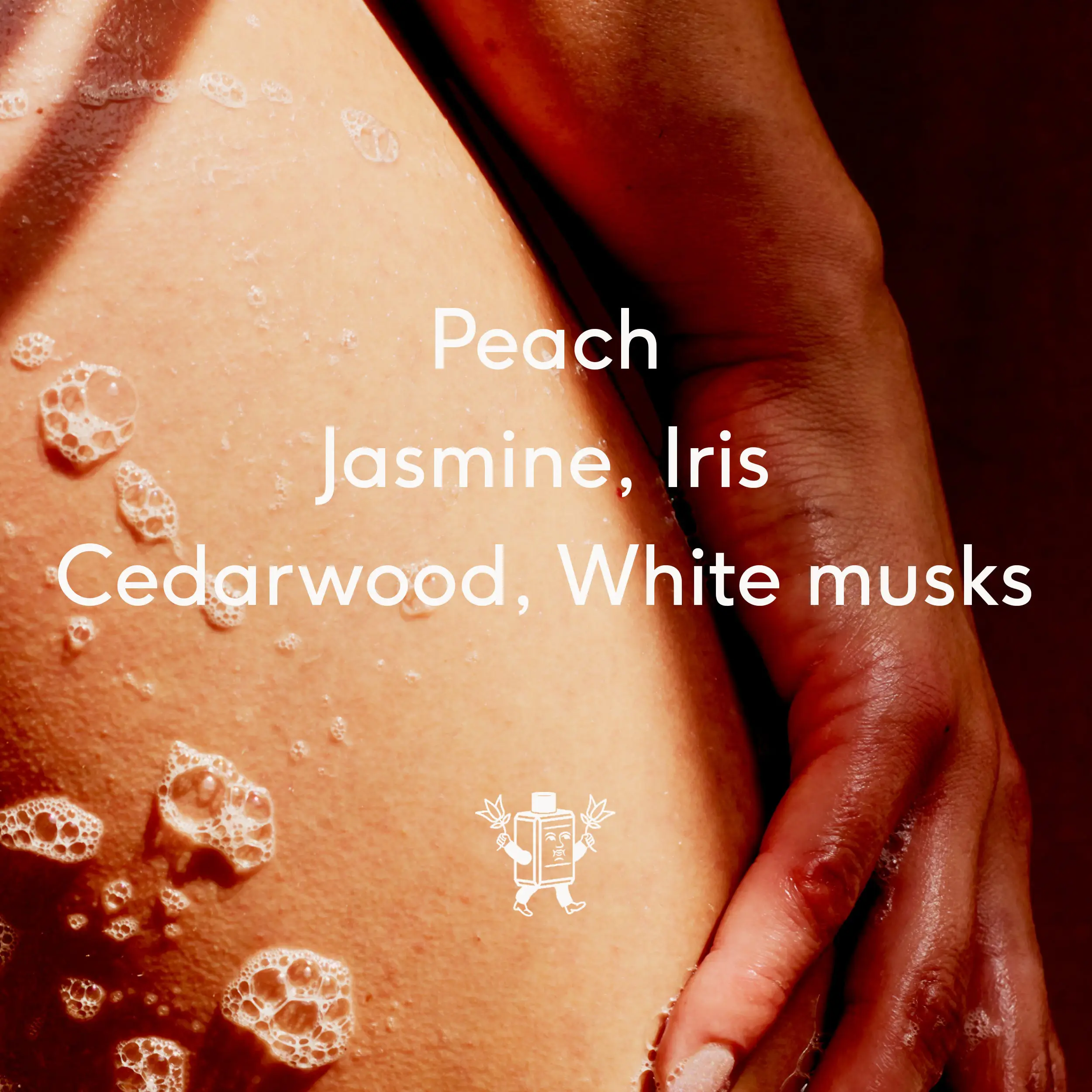 Sensual and addictive. A ripe peach opening is met with delicate florals; jasmine and iris. White musks at the base heighten the tactile feel and presence. The scent embodiment of soft skin.